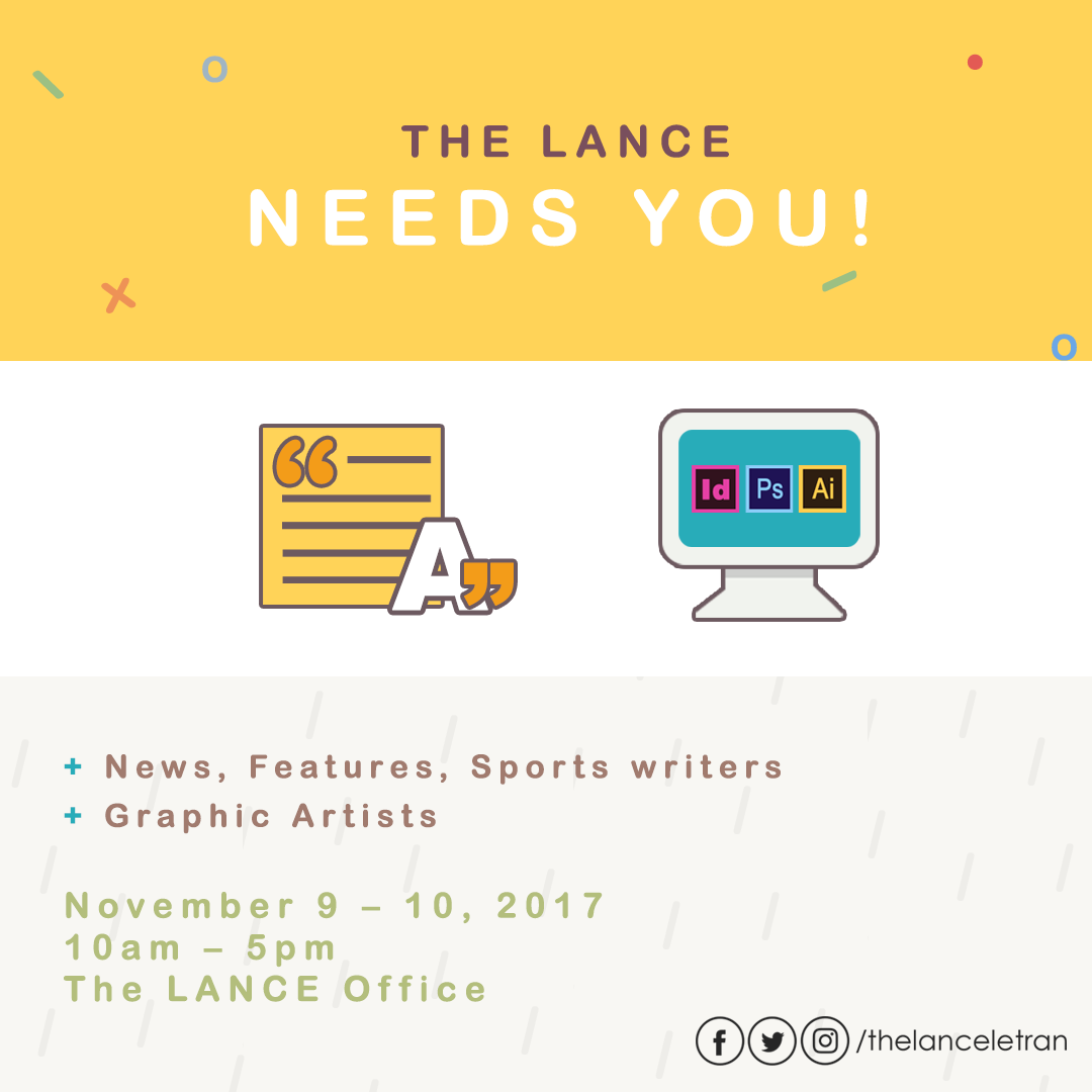 Showcase your passion in writing or skills in graphic design with us and be part of the official student publication of Letran – The LANCE.