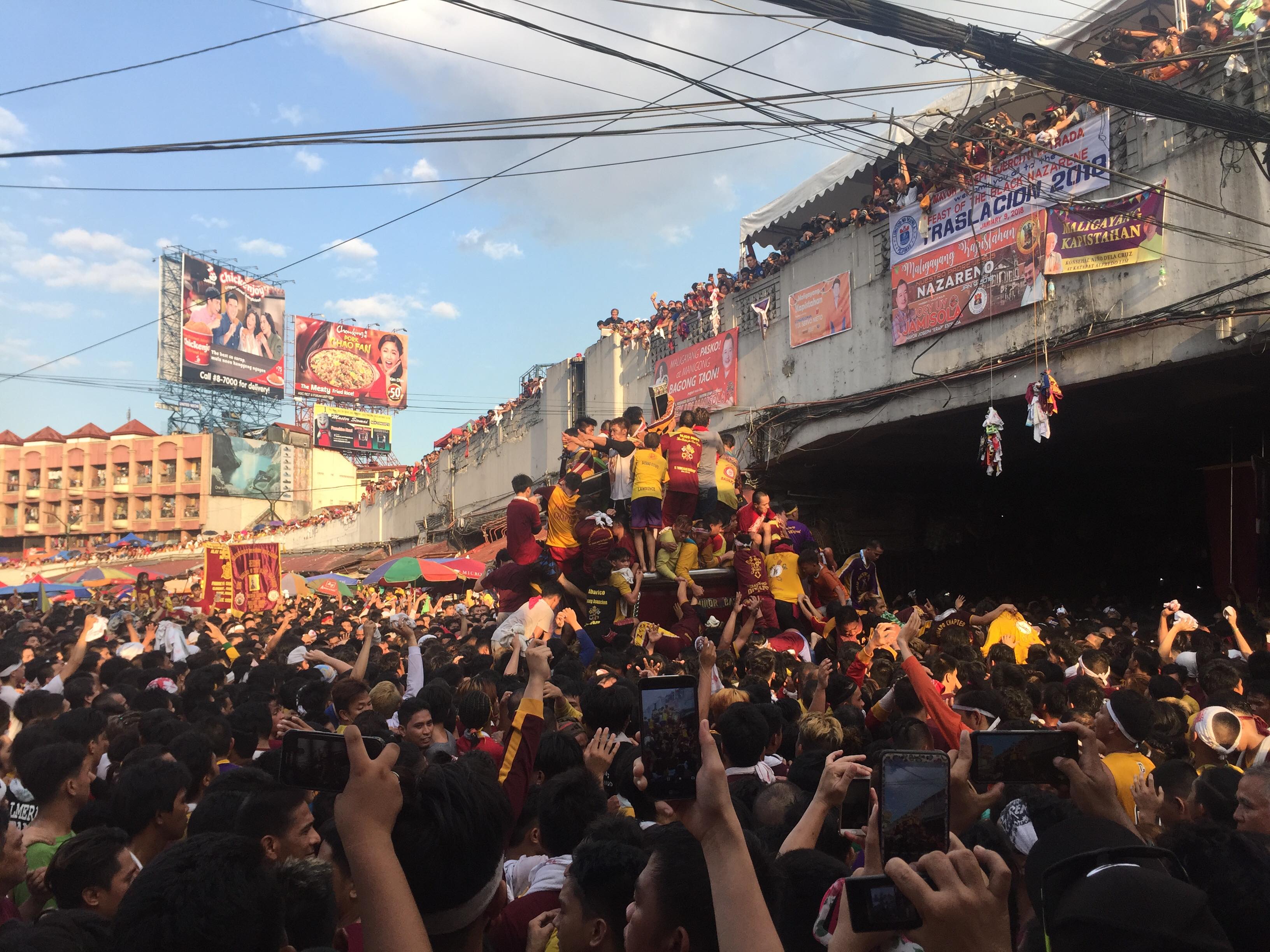 Hundreds of devotees swarm the streets and wave their handkerchiefs and towels as the andas (carriage) bearing the image of the Black Nazarene passes through Binondo earlier. Photo by JR Padlan.