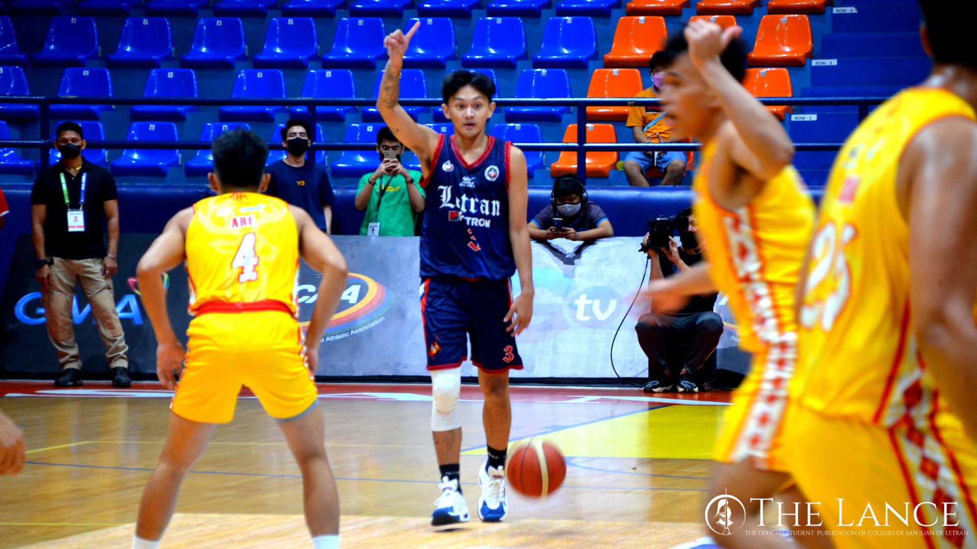 The Letran Knights in a powerful showing against the SSC-R Golden Stags, extending their winning streak to 6. Photo by Kyla Anne Velasco of The LANCE.
