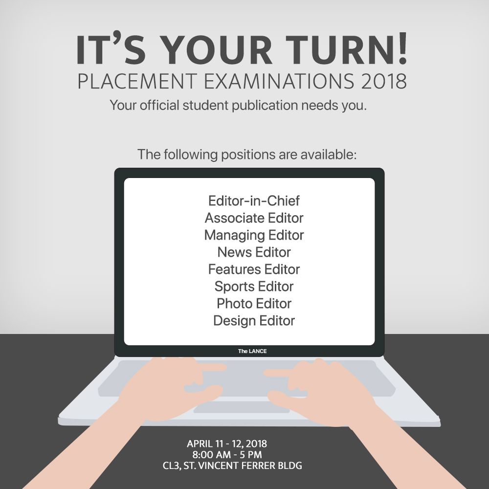 If you have the passion, commitment, and the willingness to write for the students, drop by at CL3, St. Vincent Ferrer Bldg, on April 11 and 12. Examinations will start from 8 a.m. to 5 p.m. on the said dates.