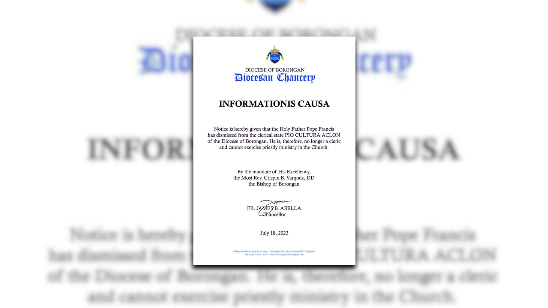 “Notice is hereby given that the Holy Father Pope Francis has dismissed from the clerical state PIO CULTURA ACLON of the Diocese of Borongan,” stated the Diocese.