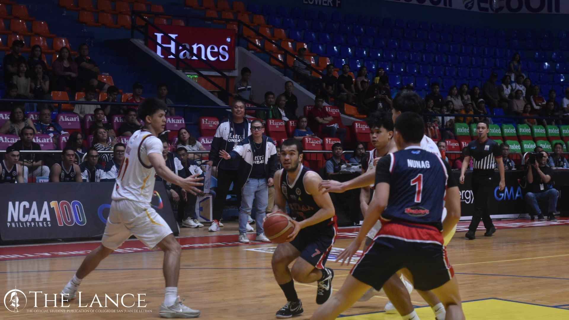 Colegio de San Juan de Letran fell short against University of Perpetual Help System DALTA in the NCAA Season 100 men's basketball second elimination round on Sunday at the FilOil EcoOil Centre. Photo Courtesy: Allen Matthew Velasquez.