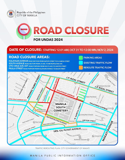 Meanwhile, the following roads leading to Manila South Cemetery shall be closed on Oct. 31 from 12:01 am until 12:00 midnight on Nov. 2.