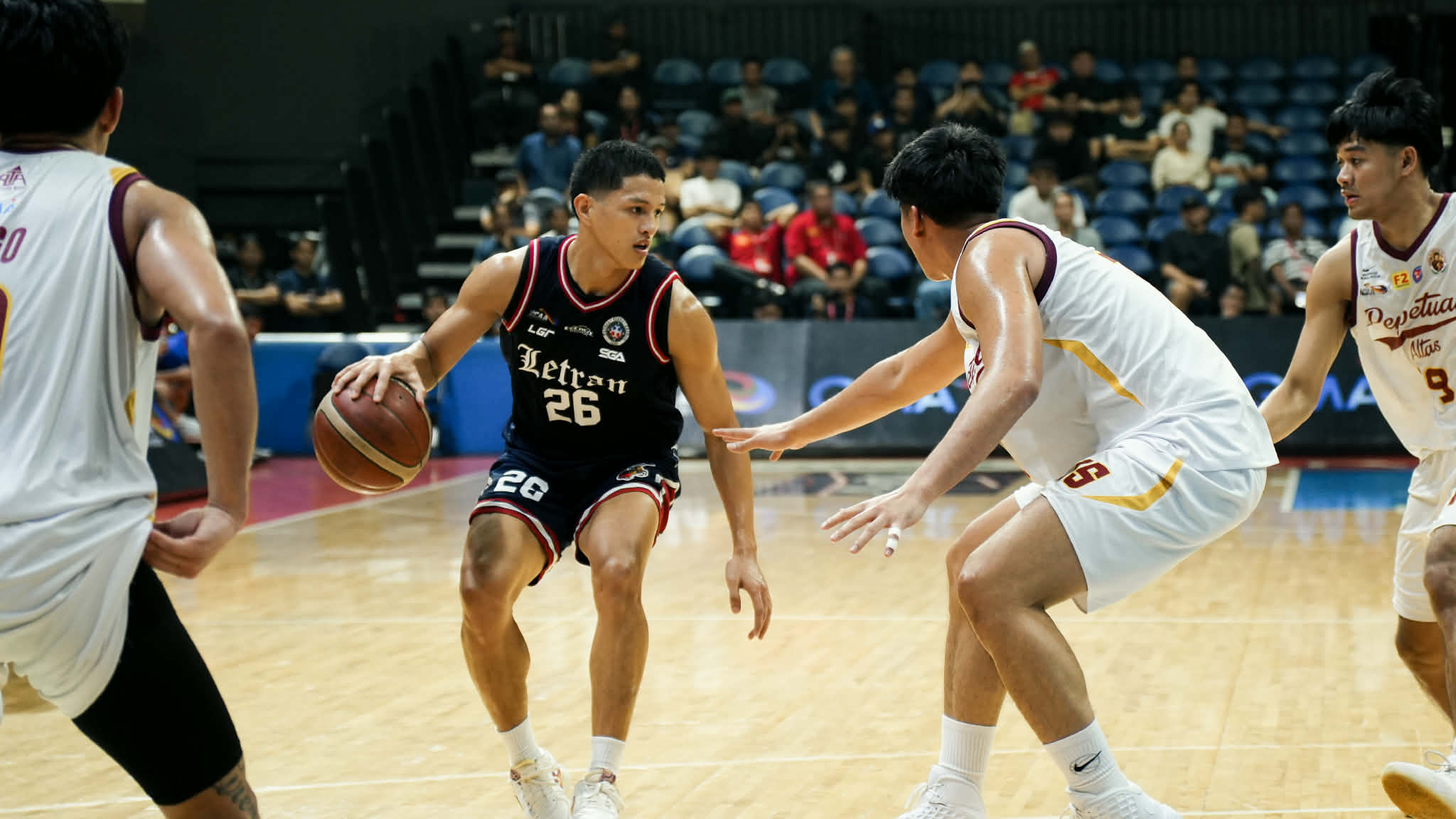Letran Knight Jimboy Estrada calmly navigates Perpetual’s defense to cap the first game of the semifinals. Photo courtesy of Kim Yoshi Espiritu | The LANCE.