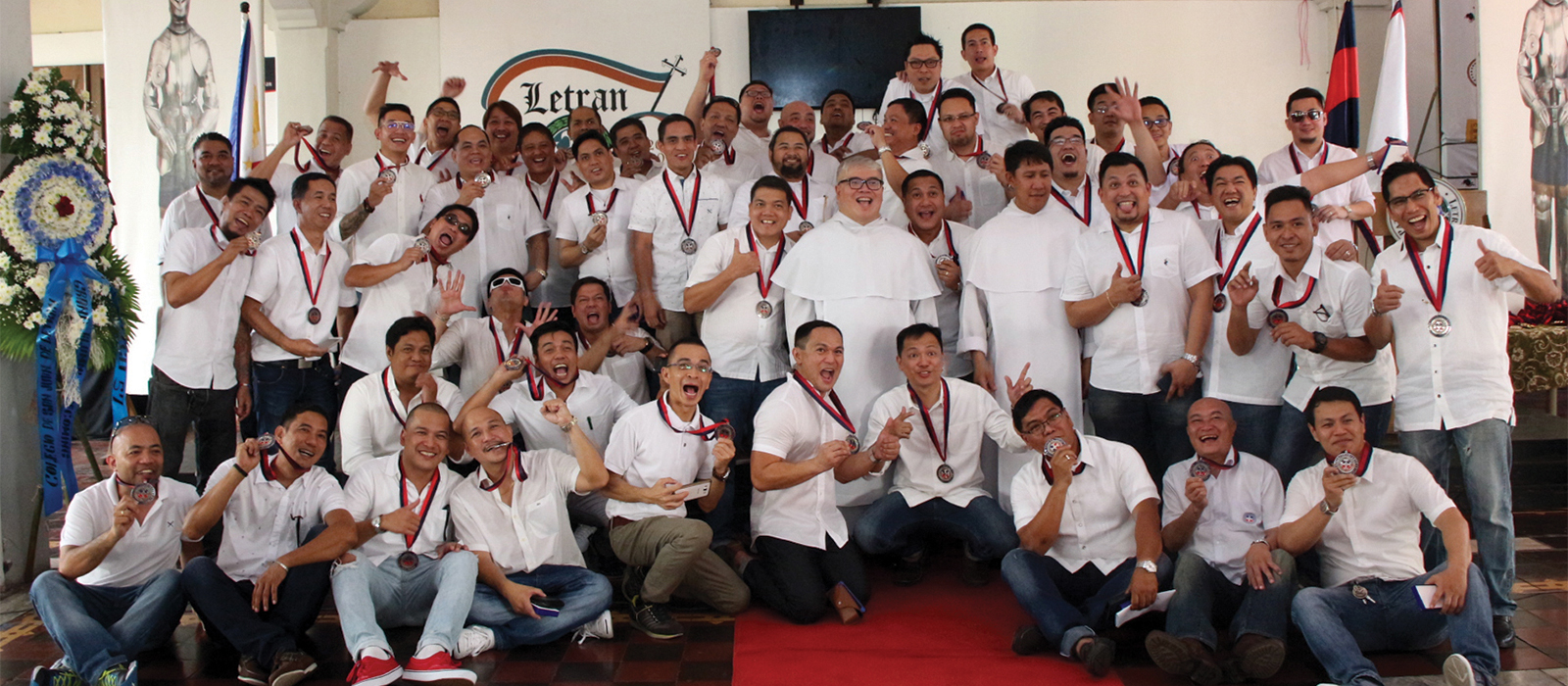 RETURNING HOME. Letran host batch '92 with Rev. Fr. Clarence Marquez, O.P. gather for a photo op during the Letran Alumni Association's 100th grand alumni homecoming in Salon de Actos. Photo from Davy Chioa/ITMS.