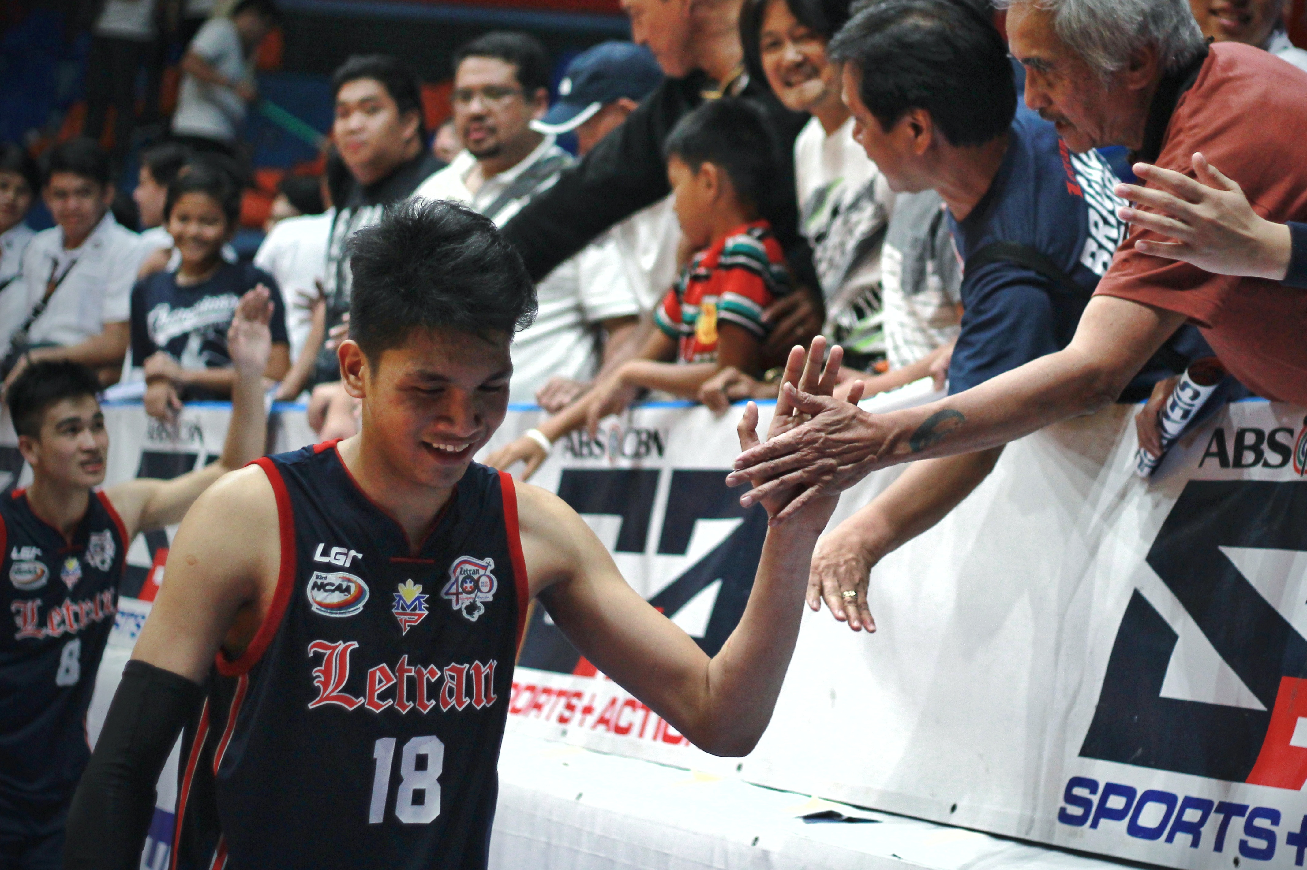 Letran bigman Jeo Ambohot raises a high-five to fans during their victory against the Arellano Chiefs last November 21, 2017 at San Juan Arena. Photo by Luis Alfonso Tamondong.