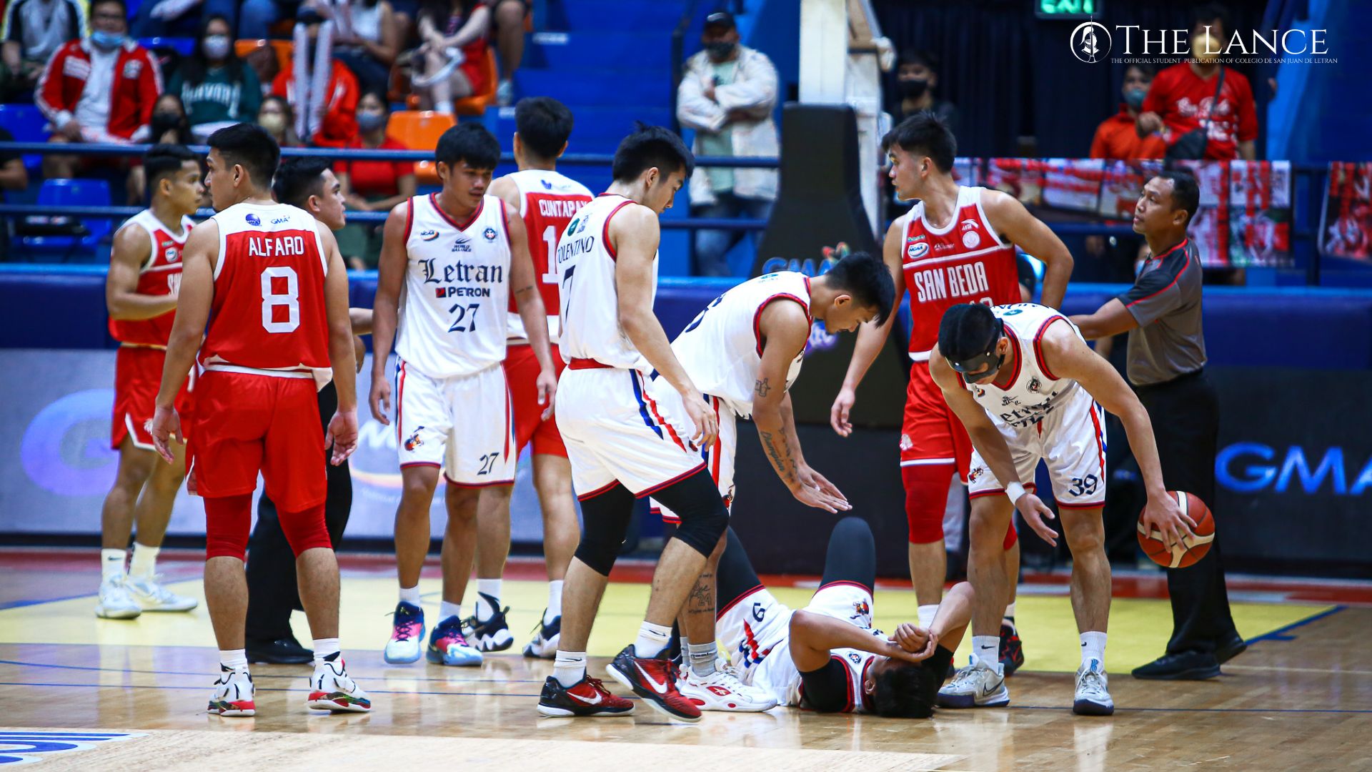 The embattled Letran Knights took a fall at its 5th game of the NCAA Season 98, versus the San Beda Red Lions at the FilOil EcoOil Arena. Photo by Patrick Dominic Romero of The LANCE.