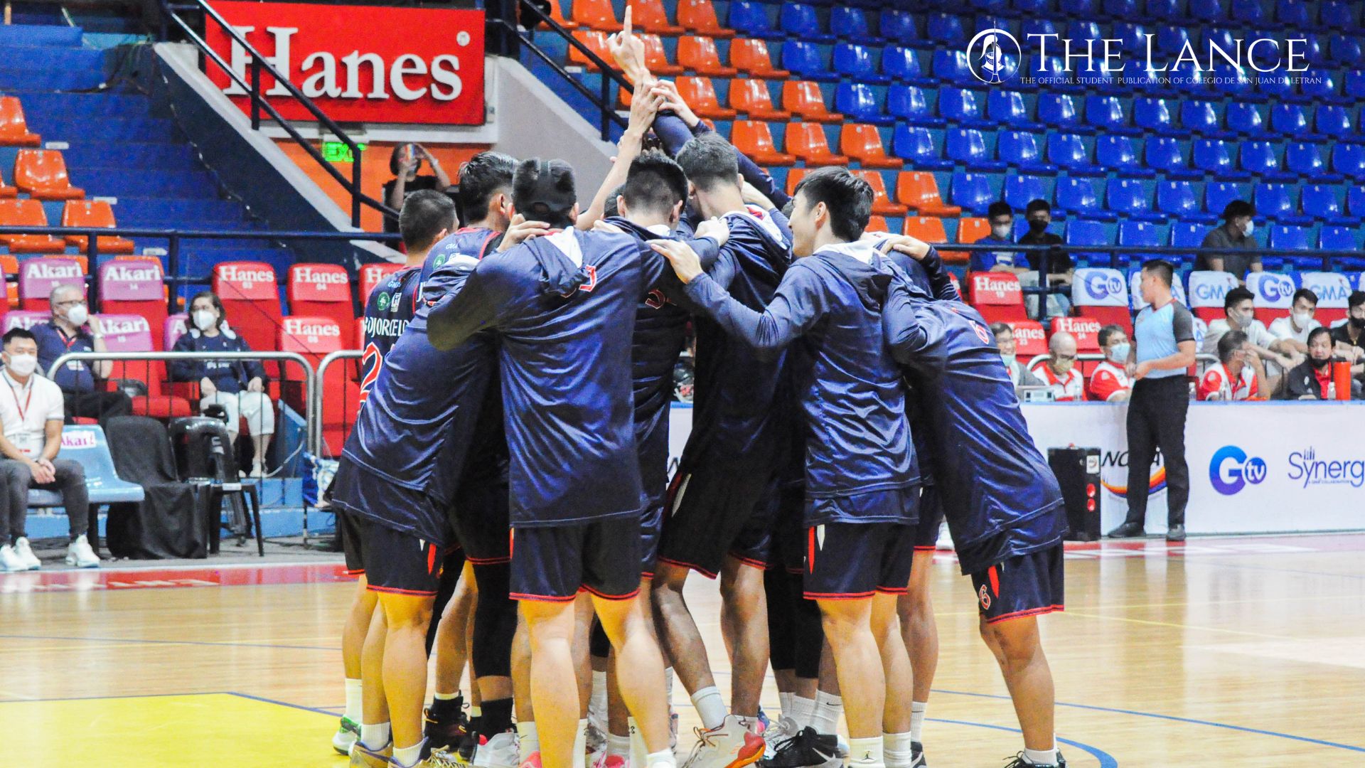 The Victors, Letran Knights huddle to celebrate a win. Photo by Patrick Cruz of The LANCE.