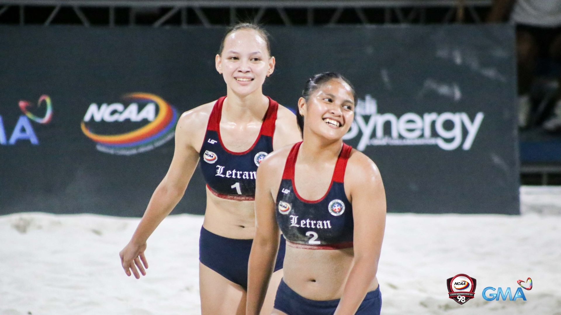 Cha Cuñada and Lara Silva of the Letran Lady Knights in their NCAA Season 98 Beach Volleyball game against the LPU Lady Pirates on January 20, 2023. Photo courtesy of GMA Sports.