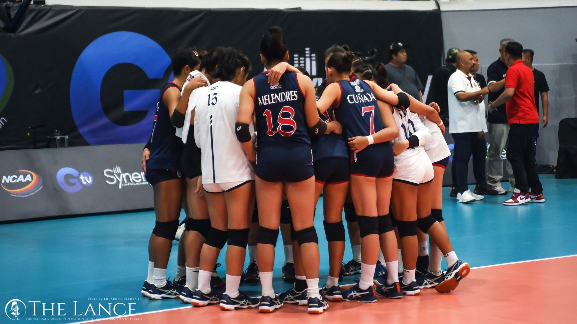 The Letran Lady Knights huddling together before the face off with the Mapua Lady Cardinals. Photo courtesy of Eduardo Nollora Jr. of The LANCE.