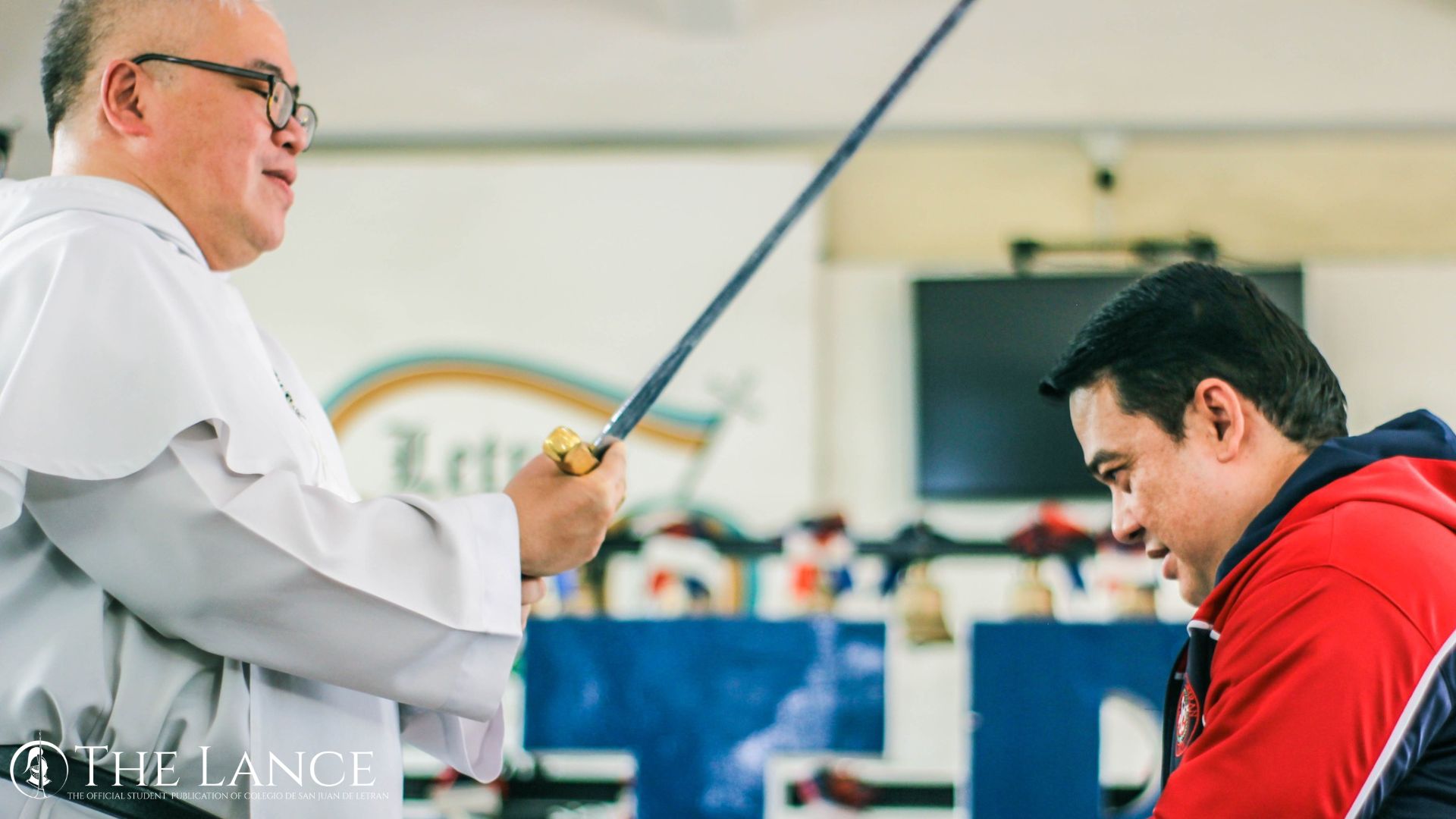 Rector and President of Letran Manila, Rev. Fr. Clarence Victor Marquez, OP. knighted the Letran Knight's newest coach, Rensy Bajar. Image courtesy of Yvonne Altaire Solon of The LANCE.