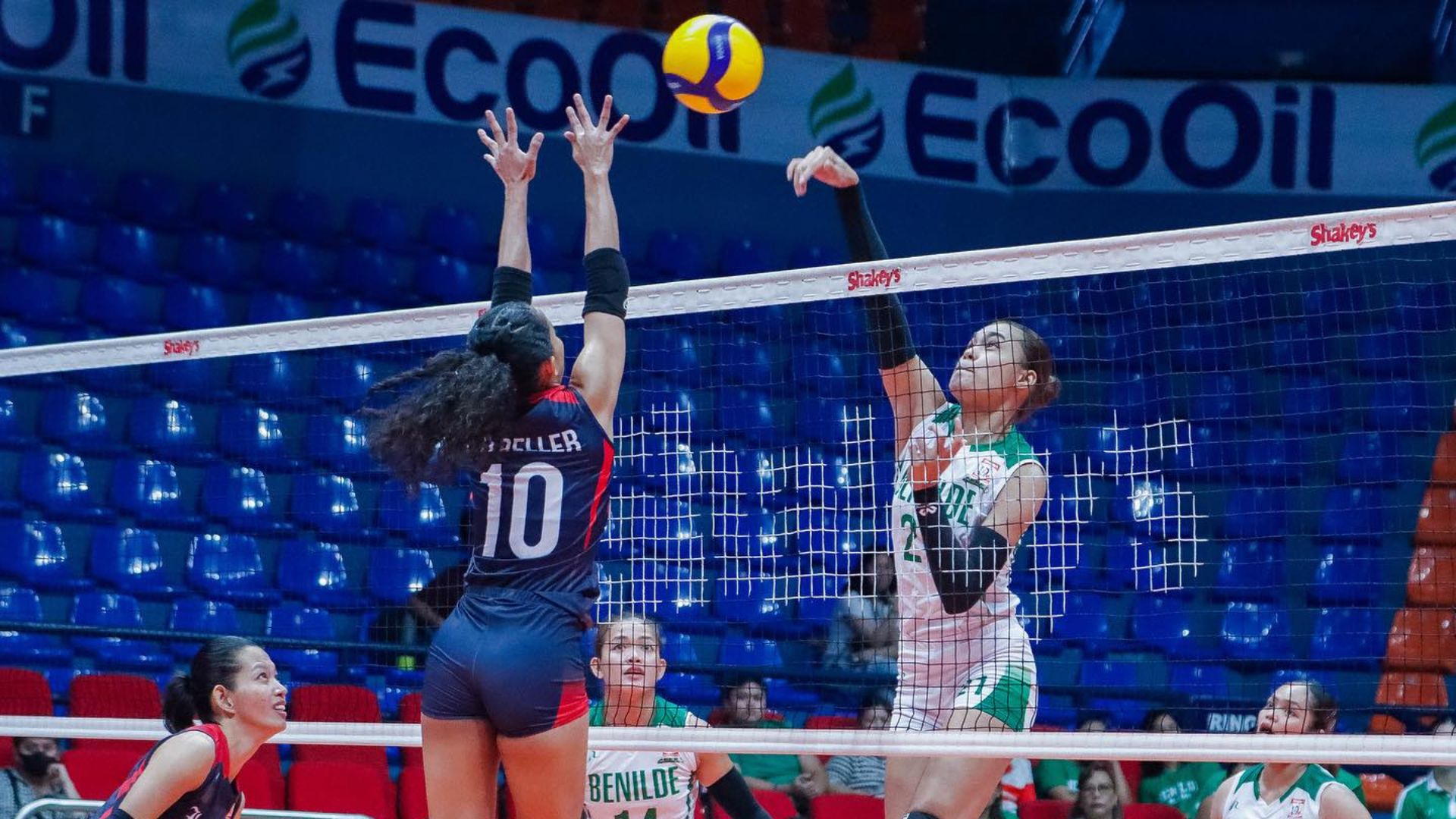 In spite of Maquilang's performance, Corrine Apostol and Jade Gentapa of Lady Blazers' led and answered back by ending the whole match, not wanting another set, 22-25.