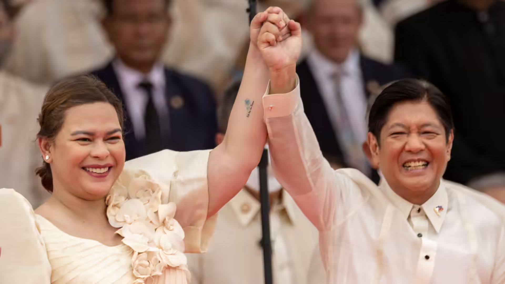 Vice President Sara Duterte and President Marcos Jr. holding victorious hands back at the end of the 2021 Presidential Elections. Photo courtesy of Nikkei Asia.