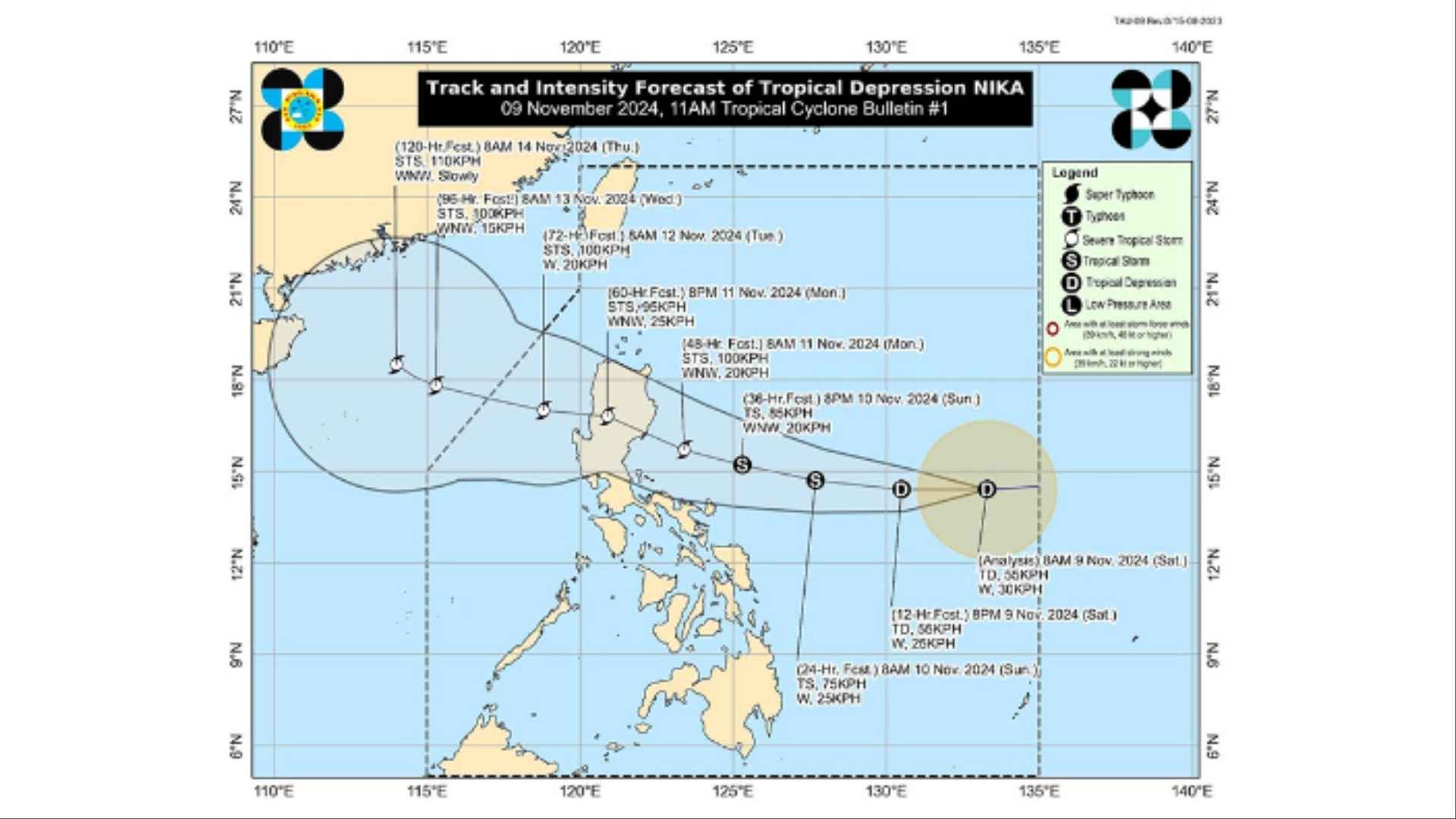 PAGASA warns that Nika could possibly reach Tropical Cyclone Wind Signal No. 3.