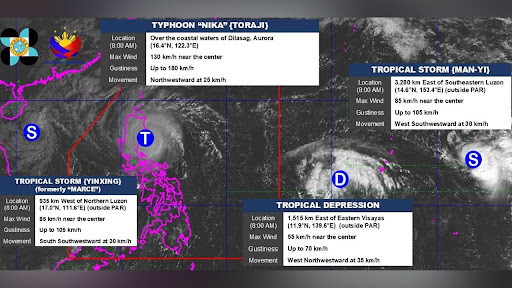 Typhoon Nika has made landfall over Dilasag, Aurora and is currently traversing Northern Luzon, placing 6 areas under Signal No. 4. PAGASA also reported on Monday, Nov. 11, that the low-pressure area (LPA) outside the Philippine Area of Responsibility has intensified into a Tropical Depression, and will be named ‘Ofel’ once it enters the PAR on Tuesday, Nov. 12.