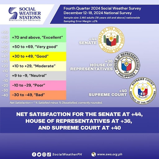 A survey conducted by Social Weather Stations (SWS) displays a decline in public satisfaction with the Congress, Supreme Court, and President in the last quarter of 2024, its lowest since the inauguration of Marcos administration.
