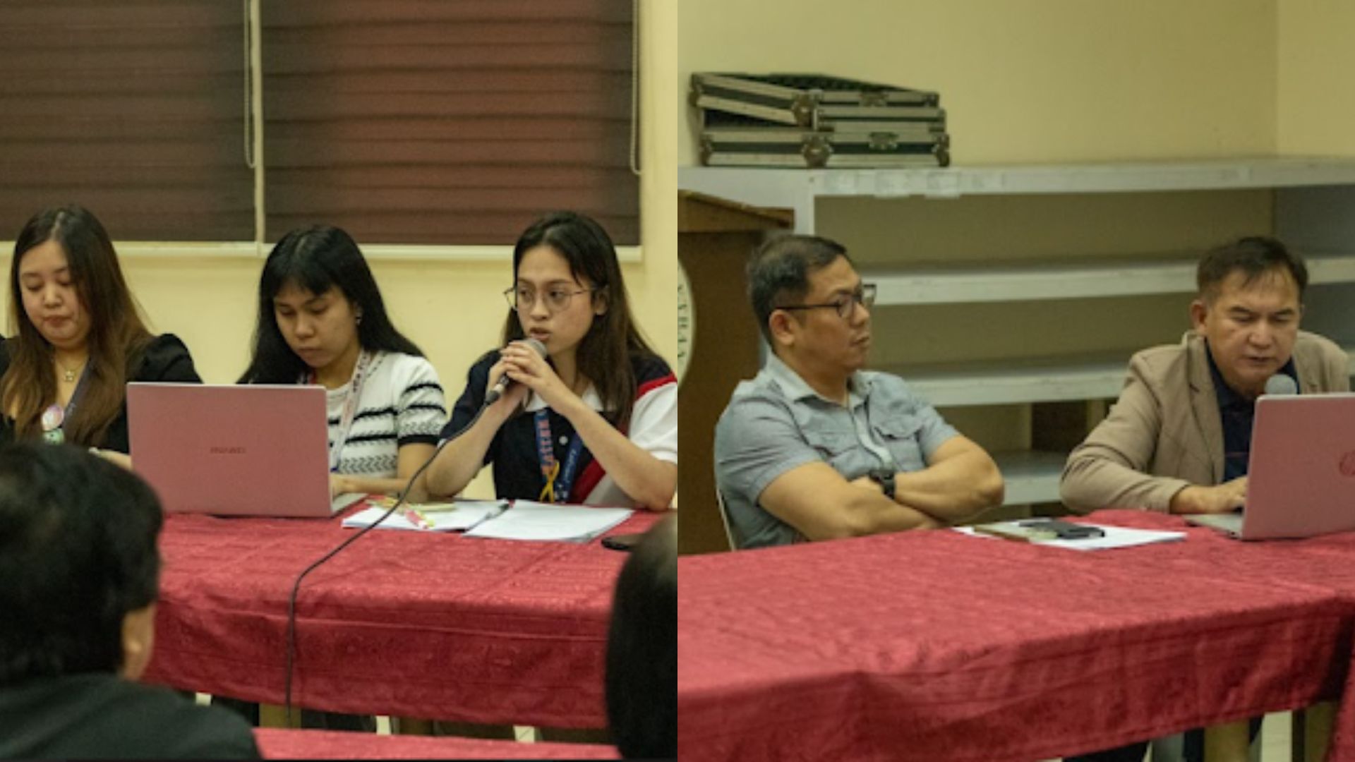(Left) LSC Vice President Clarinal providing the council’s stance on the looming TOFI and (Right) Asst. Prof. Delas Alas alongside administrators presenting the budgetary deficits of the Colegio Photo by: Ram Campos / The LANCE