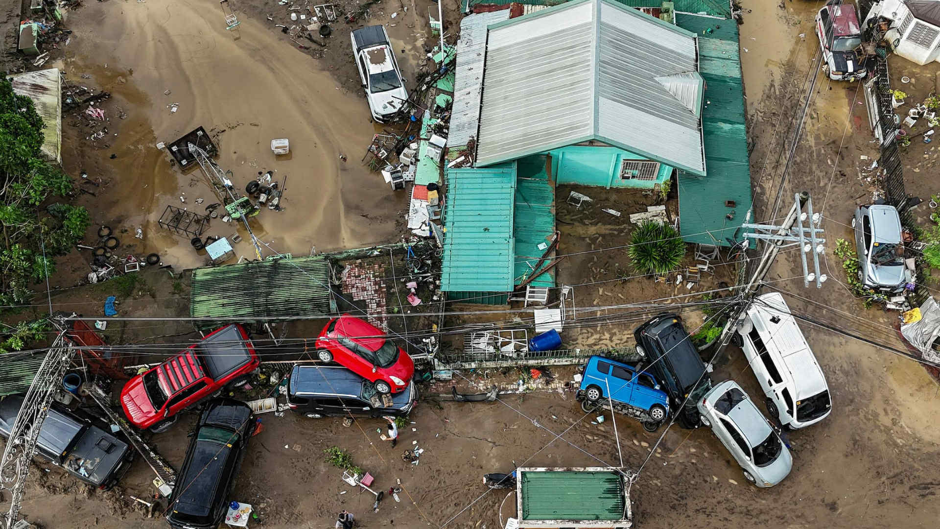 This aerial photo shows damaged vehicles in the aftermath of Typhoon Tino in Talamban, in the province of Cebu on November 5, 2025. Photo: Jam Sta. Rosa, AFP